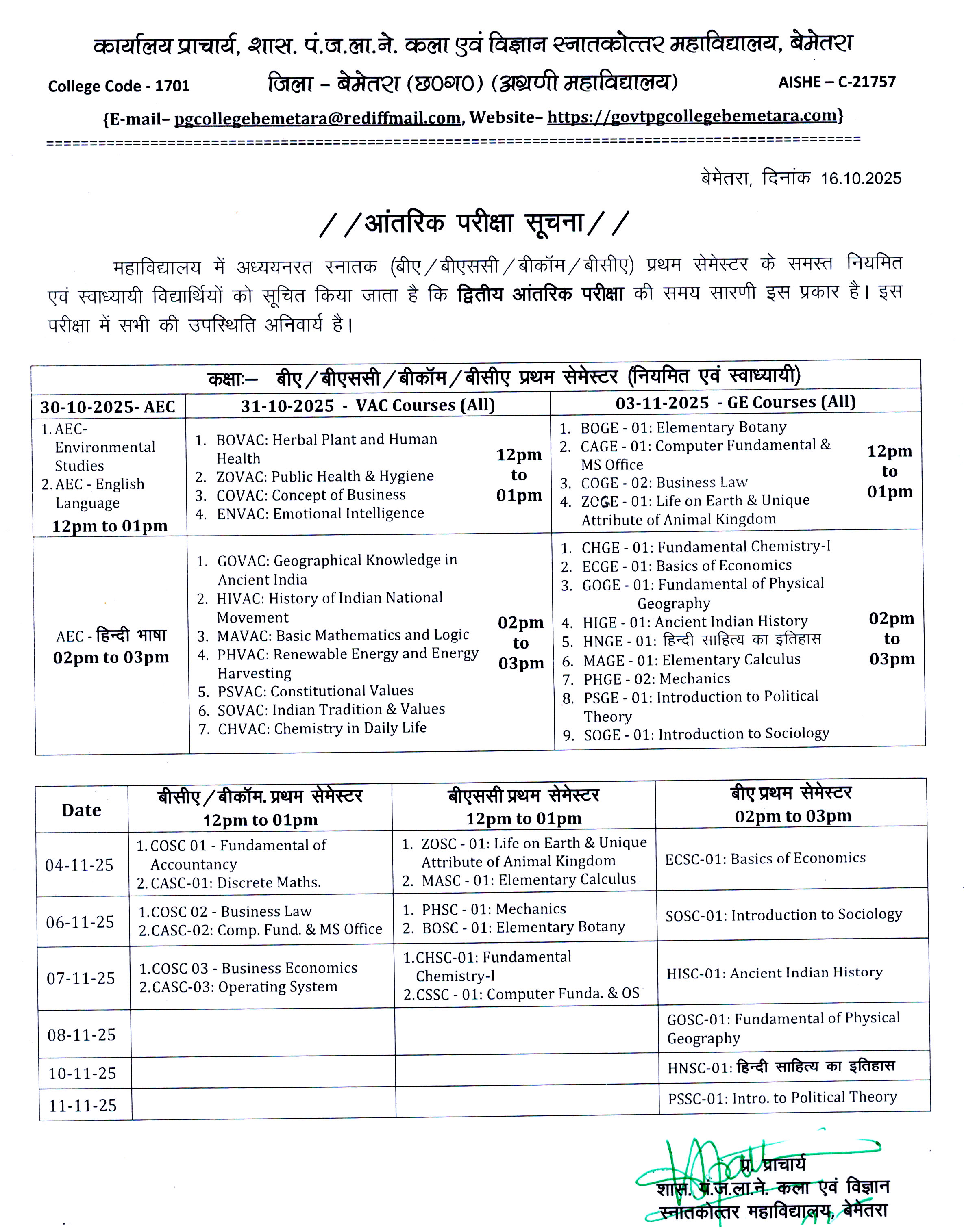 Govt. Pt. Jawahar Lal Nehru PG College, Bemetara (C.G.) is a multi-dimensional institution with the objective to impart vocational education as ell besides covering traditional streams. It could prove a milestone for an overall development of the students. The college cherishes the dream of effecting an overall development of students and influential management.
